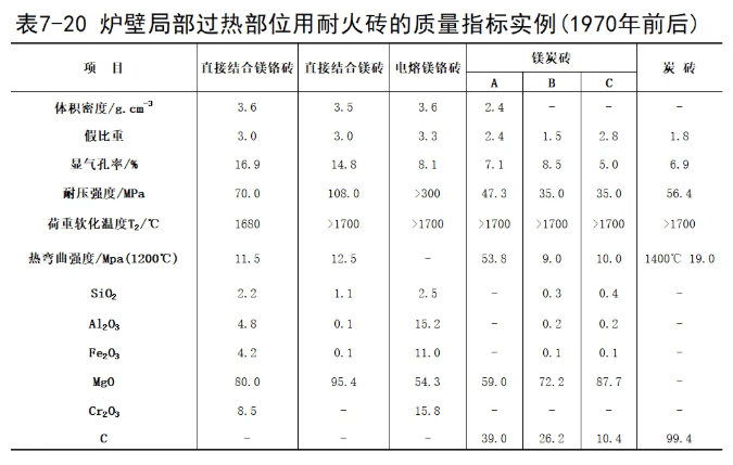 對(duì)于局部過(guò)熱用的耐火材料,如當(dāng)時(shí)期待的“起到煉鋼用耐火材料的試驗(yàn)廠的作用”那樣,使用了最高性能的耐火材料,試用了磷酸鹽結(jié)合氧化鎂質(zhì),電解鉻鎂質(zhì)等當(dāng)時(shí)最高級(jí)的耐火磚,緊接著研制1種優(yōu)質(zhì)耐火材料為鎂炭磚,此時(shí)為1970年。表7-20所示為當(dāng)時(shí)局部過(guò)熱部位用耐火磚的質(zhì)量指標(biāo)。