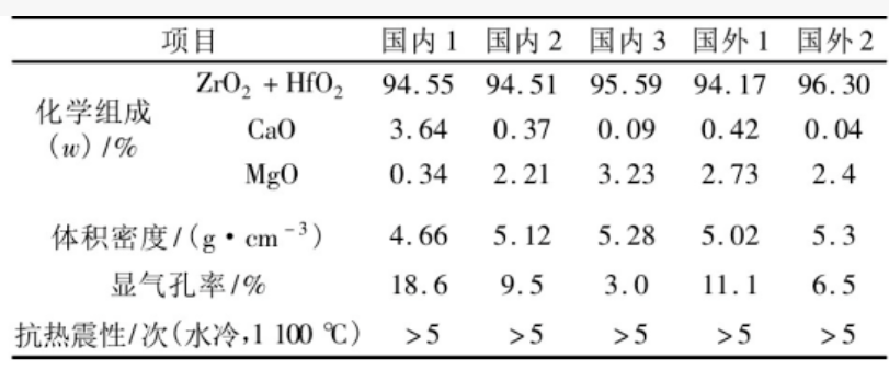 國(guó)內(nèi)外部分廠家定徑水口氧化鋯內(nèi)芯的理化性能指標(biāo)見(jiàn)表2。