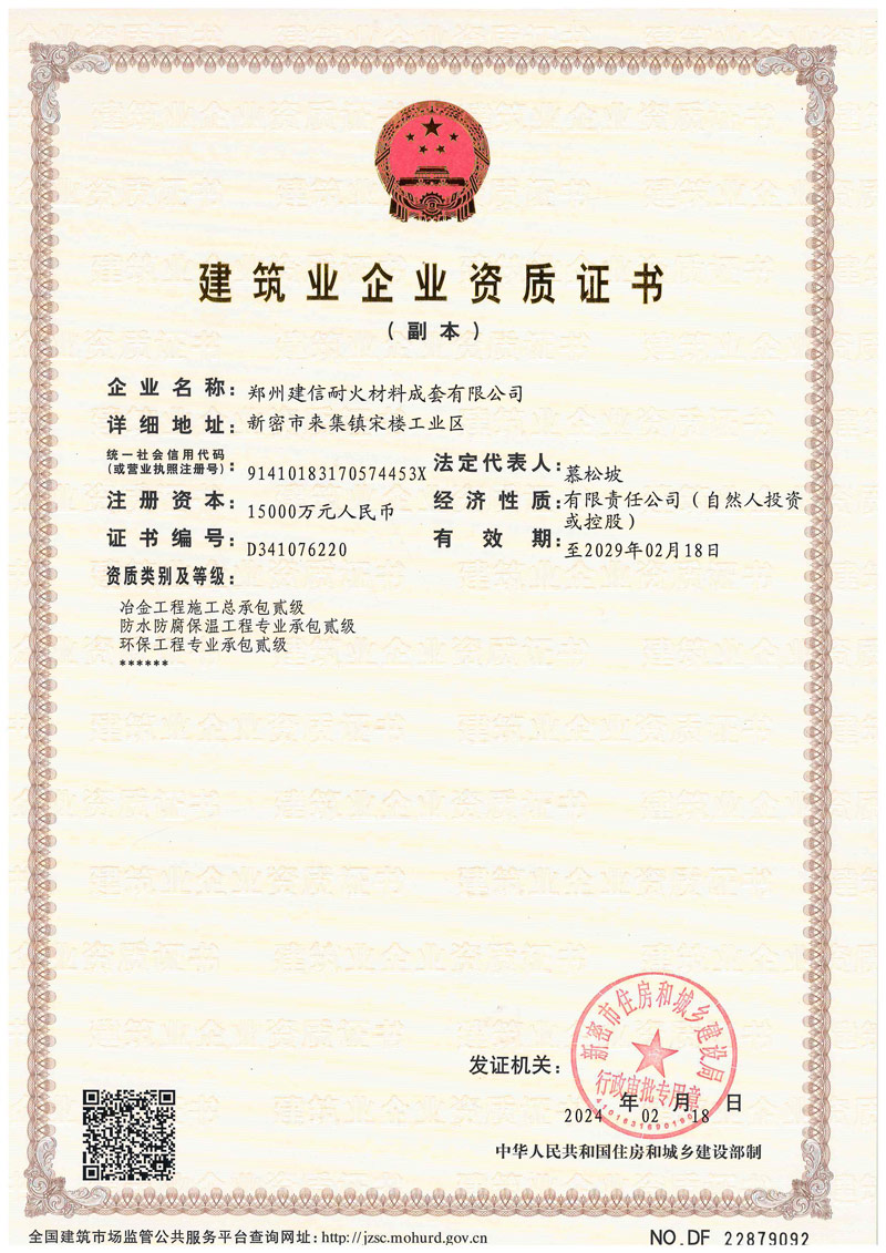 鄭州建信耐材先后參與起草國家建材及行業(yè)標準:《高鋁抗剝落磚、系列耐堿磚及系列硅莫磚》、《水泥回轉(zhuǎn)窯協(xié)同處置用耐火材料抗侵蝕實驗方法》、《耐火材料及砌筑使用規(guī)程》和《石灰窯砌筑技術(shù)條件》。公司近年來先后榮獲“國家科技型企業(yè)”、“高新技術(shù)企業(yè)”、“河南省綠色工廠”“河南省綠色發(fā)展先進型企業(yè)”“環(huán)??冃級企業(yè)”、鄭州市“專精特新企業(yè)”“市長質(zhì)量獎”等殊榮。